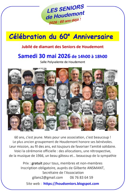 Célébration du 60e anniversaire le samedi 30 mai 2026 de 14h00 à 18h00 à la salle polyvalente, organisée par Les Seniors de Houdemont.